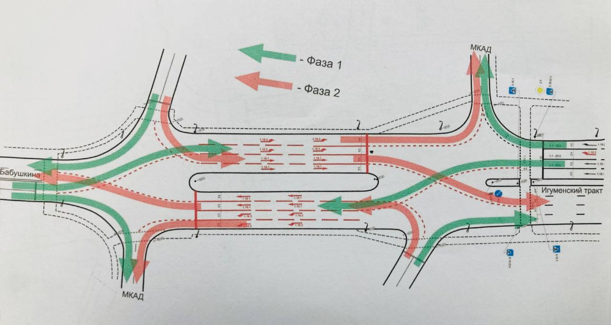 Применение схемы движения транспортных средств по типу алмазной развязки на пересечении МКАД, Игуменского тракта и улицы Бабушкина исключает конфликт транспорта при повороте налево, что положительно повлияет на безопасность дорожного движения и повышает пропускную способность всего транспортного узла до 30%. А пропускная способность входа увеличивается на 50%, что позволяет снизить общие потери в дорожном движении.